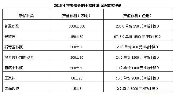 2013年,由于年初大面積、長時(shí)間的霧霾事件,引起了政府的高度重視,從國務(wù)院到各省市政府紛紛出臺(tái)大氣污染防治政策。“建筑揚(yáng)塵”成為眾矢之的,禁止 現(xiàn)場(chǎng)攪拌砂漿的力度提升到前所未有的高度。從發(fā)展趨勢(shì)來看,無論建筑市場(chǎng)如何波動(dòng),干混砂漿都將保持兩位數(shù)的增長。未來幾年期內(nèi),我國干混砂漿市場(chǎng)將有一 個(gè)較快幅度的穩(wěn)定增長。經(jīng)匯總專家、顧問意見,采用類比法、德菲爾法等綜合測(cè)算, 2018年各類砂漿市場(chǎng)預(yù)測(cè)統(tǒng)計(jì):